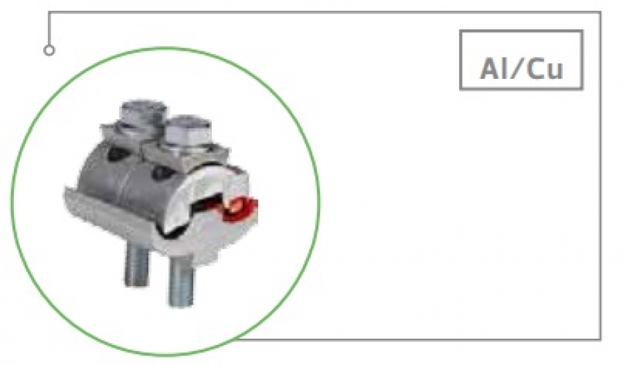 Zaciski odgałęźne Al/Cu 2 stosowane są do połączeń pomiędzy aluminiowymi przewodami gołymi linii głównej z miedzianymi przewodami gołymi odgałęzienia.