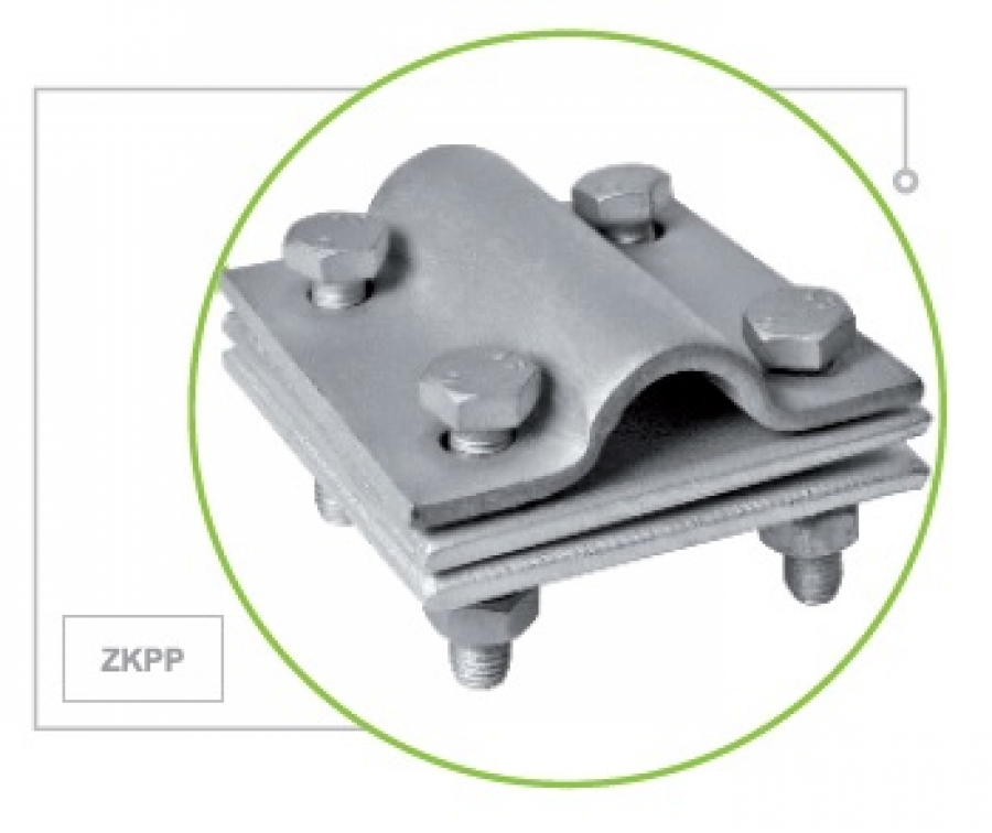 Zacisk krzyżowy ZKPP służy do łączenia pręta uziemiającego cynkowanego z bednarką cynkowaną. Zacisk wykonany z blach stalowych cynkowanych metodą zanurzeniową „ogniowo” zgodnie z normą PN-EN ISO 1461.